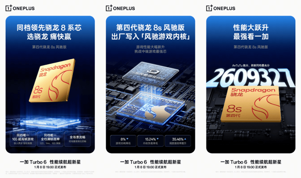 随后,@一加手机 持续官宣,“一加 Turbo 6 搭载第四代骁龙 8s 风驰版!
