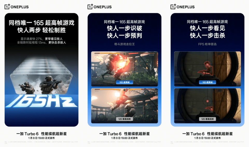 在屏幕方面,官方发布预热海报,并配文称,“一加 Turbo 6 支持同档唯一的 165 超高帧游戏!